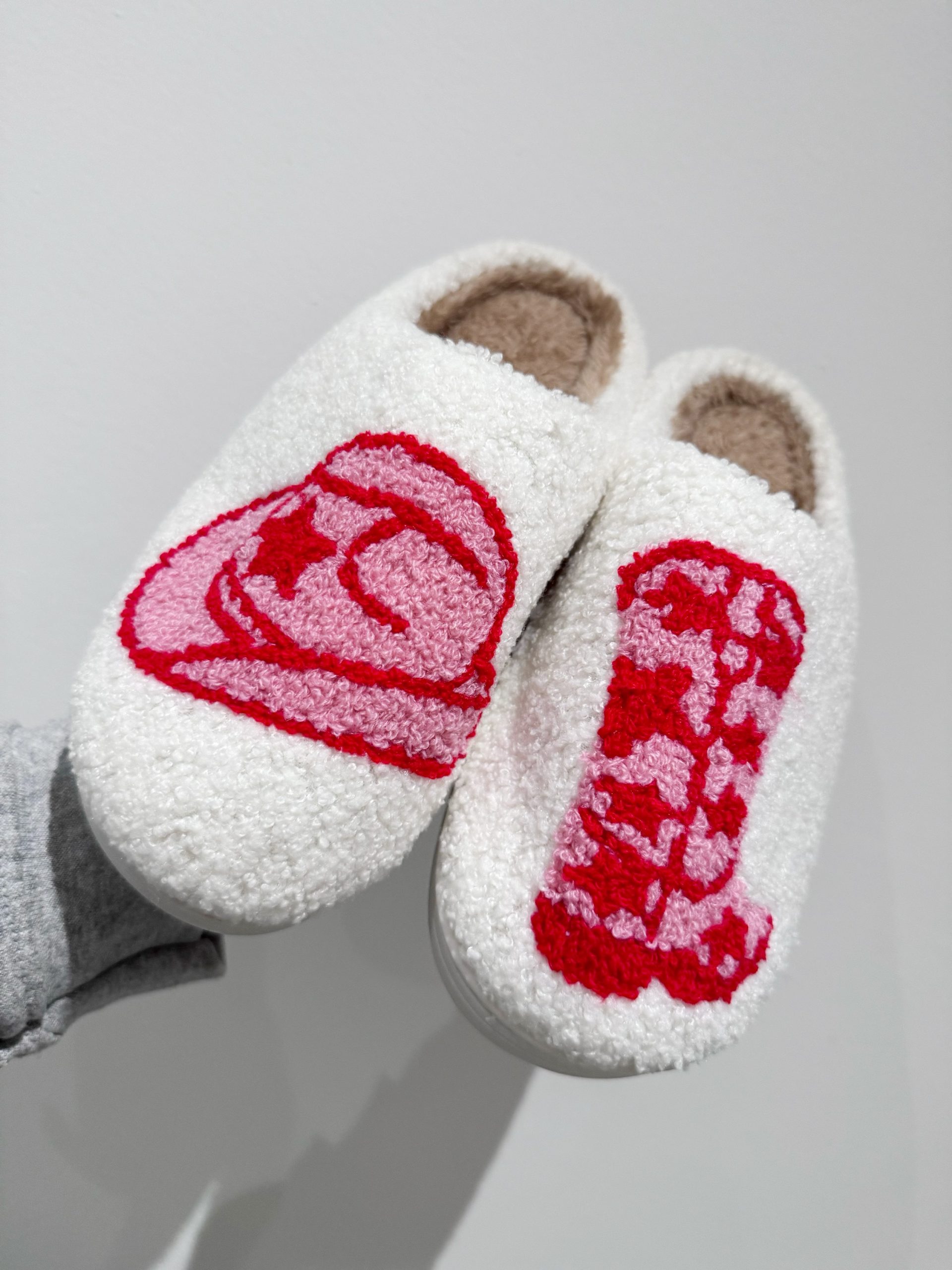 Introducing the “Cowgirl Slippers” – where Western flair meets ultimate comfort! These slippers have a vibrant pink design with a cowboy hat on one slipper and a cowboy boot on the other. Made with a soft, plush fabric they offer a cozy fit, these slippers are a must-have for any cozy cowboy or cowgirl!